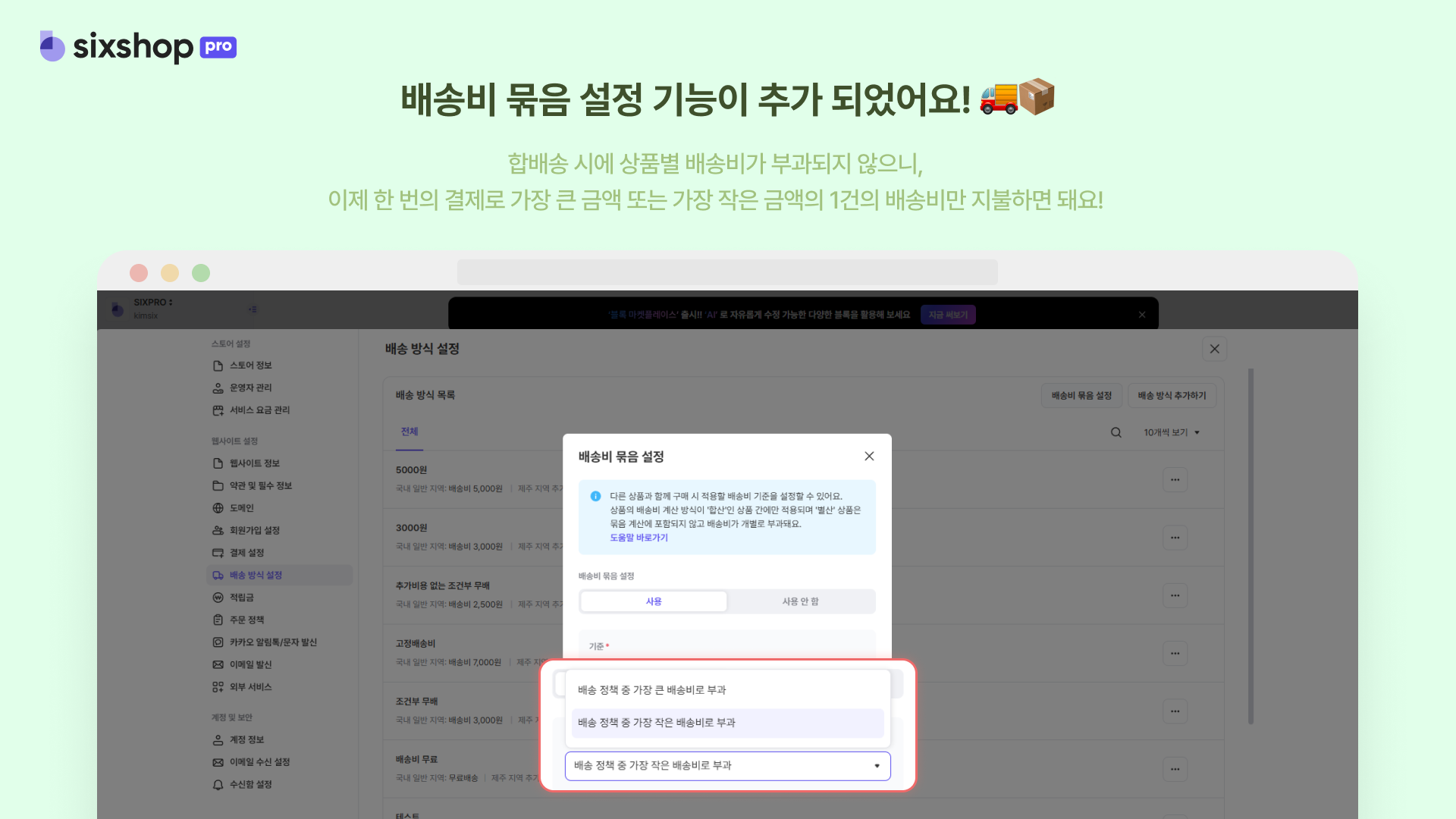 μ΄μ λ βλ°°μ‘λΉ λ¬Άμ μ€μ β κΈ°λ₯μ΄ μλ‘ μΆκ°λμ΄ μνλ μ€μ μ λ°λΌ κ°μ₯ ν° κΈμ‘μ΄λ κ°μ₯ μμ κΈμ‘μ λ°°μ‘λΉ 1κ±΄λ§ μ μ©λμ΄μ.